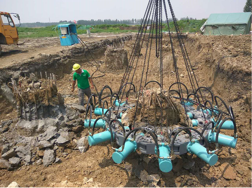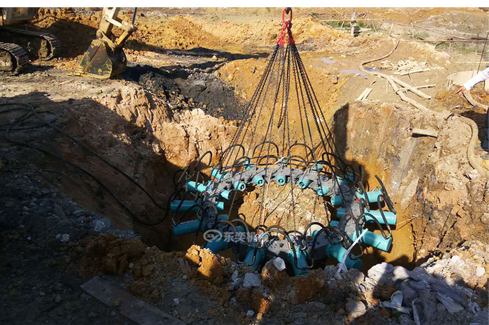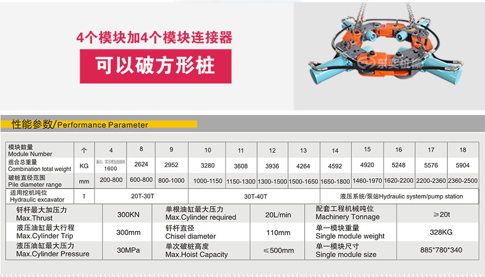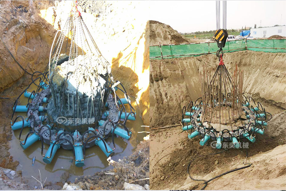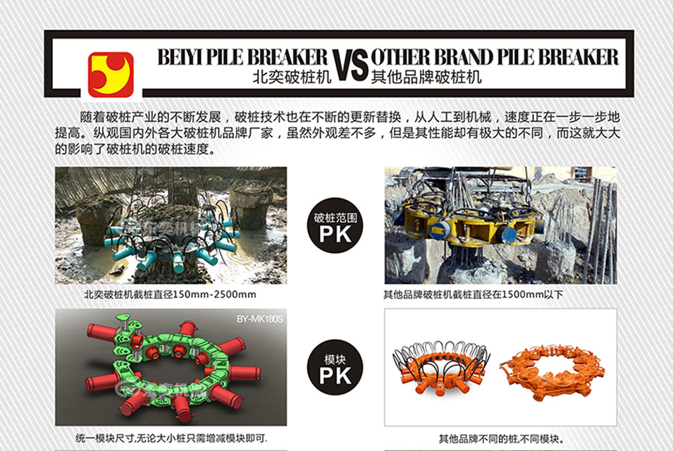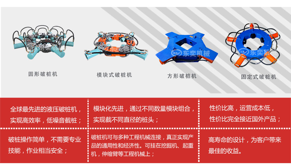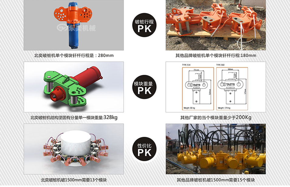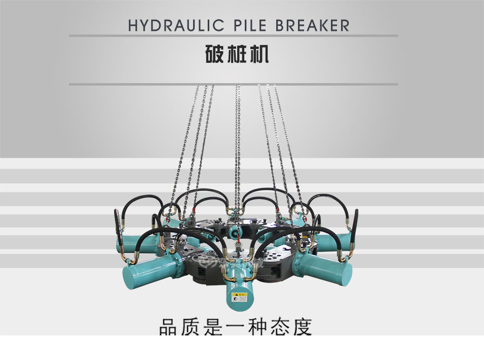 破桩机通过动力源给破桩机多个油缸提供压力,油缸直接驱动钎杆,同时挤压桩身,使桩头截除。破桩机施工过程中,操作简单,高效率,低噪音,低成本,适用于桩群施工工程中。破桩机采用高度模块化组合,通过销轴联接模块,可以通过不同模块数量组合,截除一定范围内直径桩头。